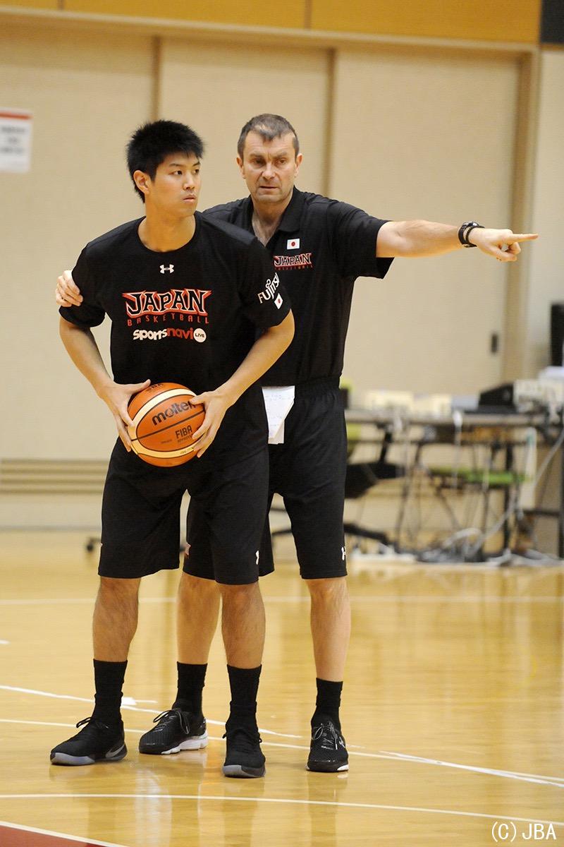 ルカ・パヴィチェヴィッチ テクニカルアドバイザーに細かく指導を受ける杉浦 佑成選手(サンロッカーズ渋谷/筑波大学 3年)