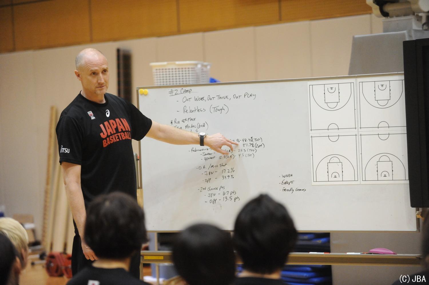 初参加となったリオオリンピックメンバーに今年のスローガンを説明するトム・ホーバスヘッドコーチ