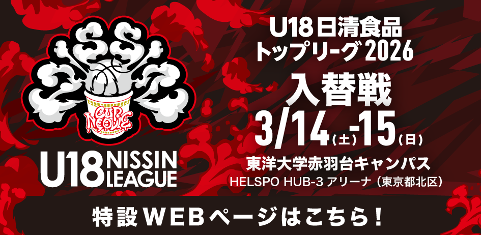 2026年2月13日 「U18日清食品トップリーグ2026入替戦」競技日程決定のお知らせ ~ チケット購入と申込は2/16(月)からJBA LINE公式アカウントにて受付開始、「U18日清食品リーグ公式YouTube」「バスケットLIVE」で全試合LIVE配信 ~