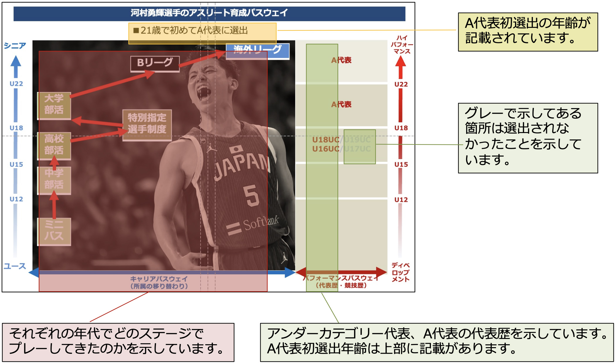 アスリート育成パスウェイという考え方から、選手の所属の移り変わりで道を辿ったものを「キャリアパスウェイ」として示し、代表歴等のパフォーマンスをたどったものを「パフォーマンスパスウェイ」として次に示しています。